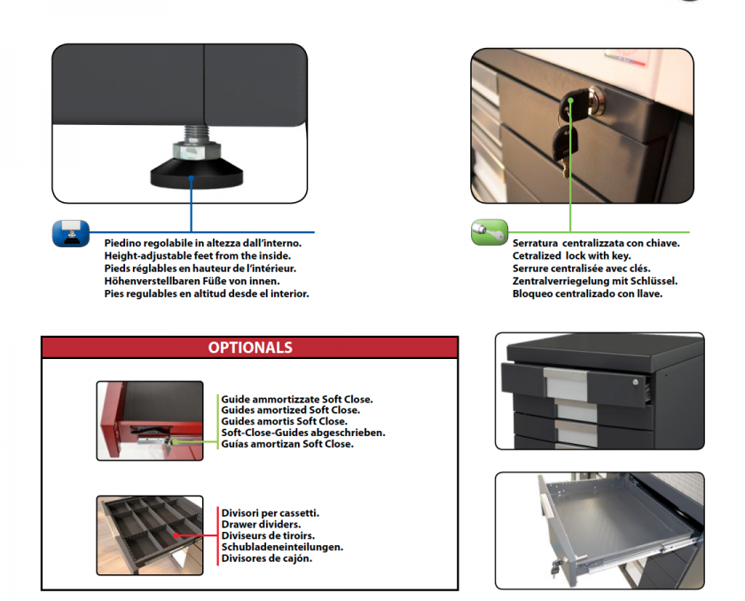• Adjustable feet in height for correct positioning of the drawer module to the floor ( range from 0 to 25 mm).