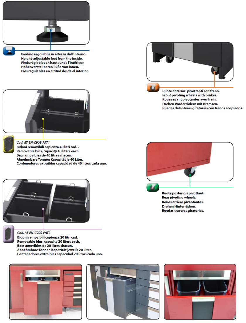 • Front and rear pivoting wheels, the front ones are equipped with brakes (only for AT-C2-CS90S and AT-C2-CS90S/4).