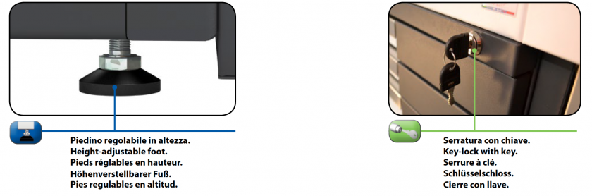 • Height-adjustable feet in order to allow the correct positioning of the bench on the floor (excursion from 0 to 25 mm).