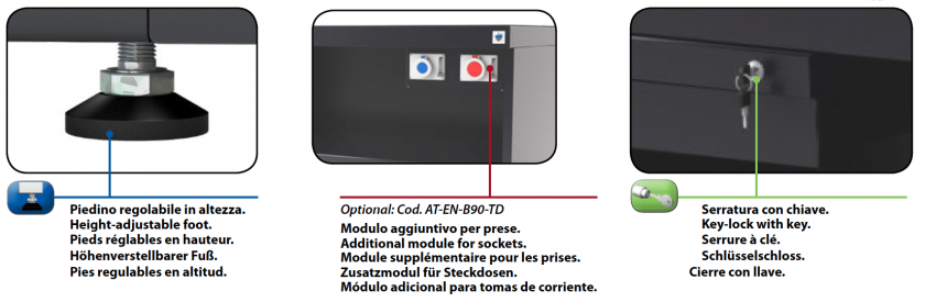 • Height-adjustable feet in order to allow the correct positioning of the bench on the floor (excursion from 0 to 25 mm).